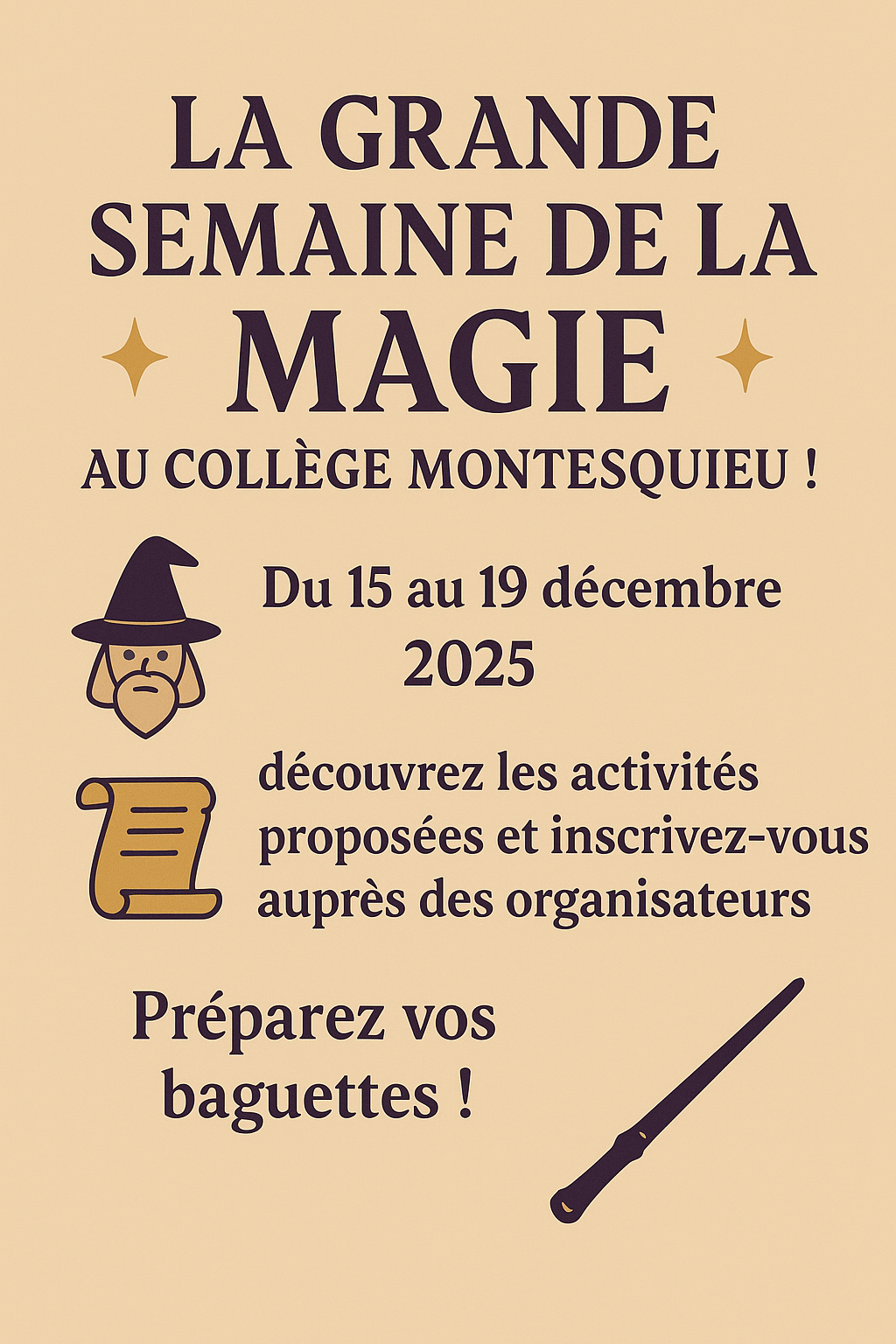 🪄 Du 15 au 19 décembre 2025, le collège Montesquieu vivra une grande semaine magique : découvrez les activités proposées et inscrivez-vous auprès des organisateurs. Préparez vos baguettes ! ✨
